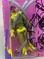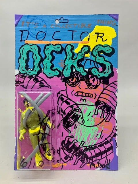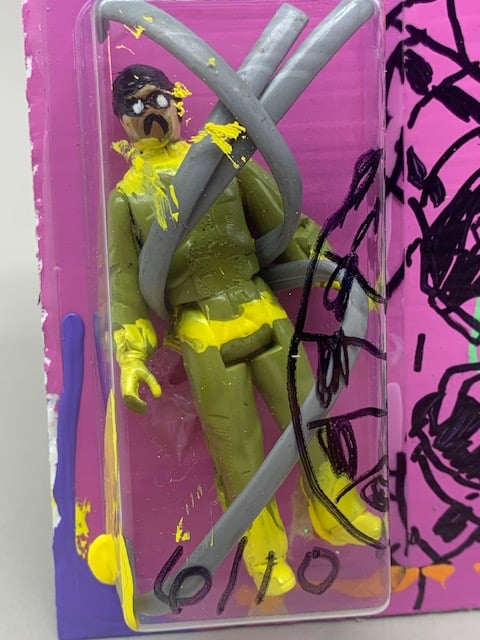 mixed media on board with altered action figure